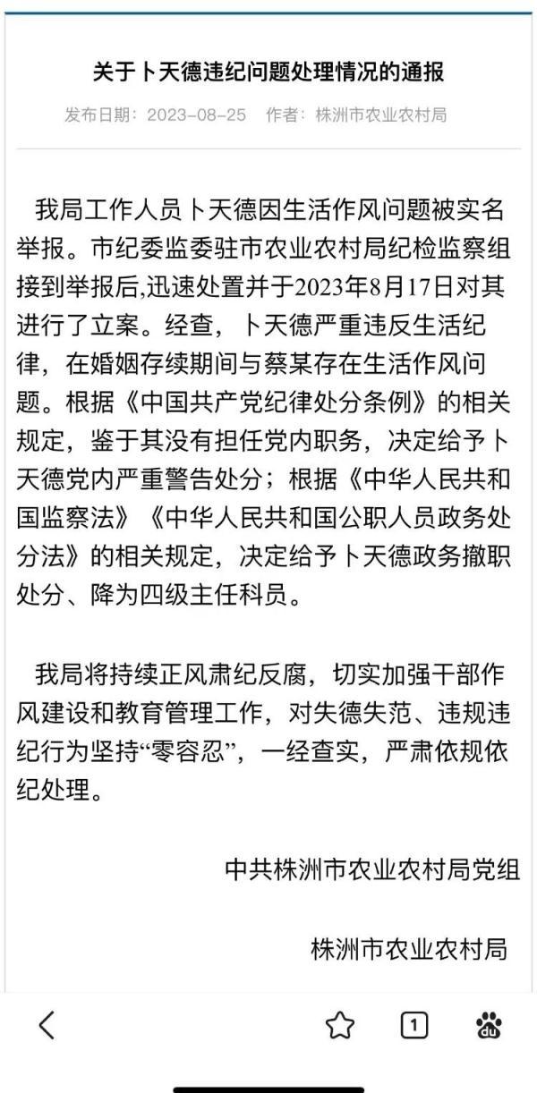 25日晚,中共株洲市农业农村局党组、株洲市农业农村局发布关于卜天德违纪问题处理情况的通报:给予卜天德政务撤职处分、降为四级主任科员。通报全文如下↓