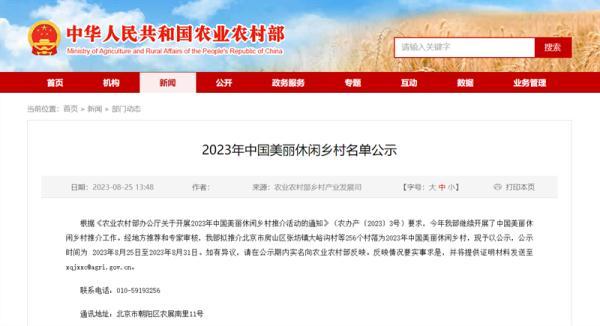 8月25日,从农业农村部官网获悉,2023年中国美丽休闲乡村名单开始公示。经地方推荐、专家审核,拟推介北京市房山区张坊镇大峪沟村、河北省邯郸市永年区永合会镇王边村等256个村落,为2023年中国美丽休闲乡村。其中,河北共有8个村榜上有名,公示时间为8月25日至8月31日。