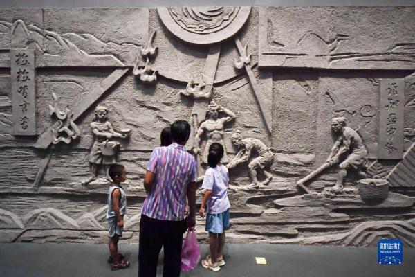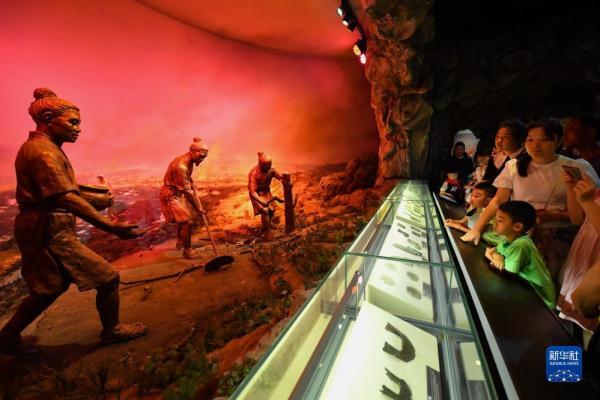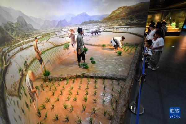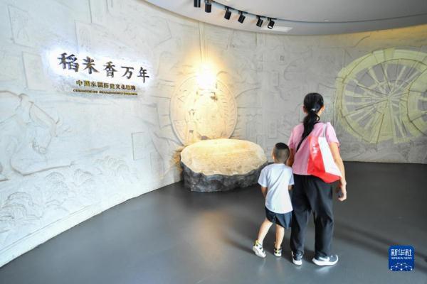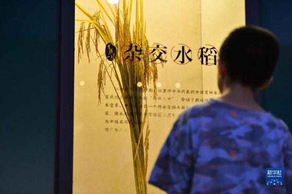 8月26日,在长沙市芙蓉区的隆平水稻博物馆,家长带着孩子参观“中国水稻历史文化陈列”。