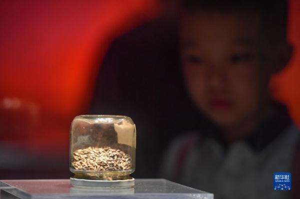 8月26日,在长沙市芙蓉区的隆平水稻博物馆,小朋友在参观马王堆1号汉墓出土的稻谷。