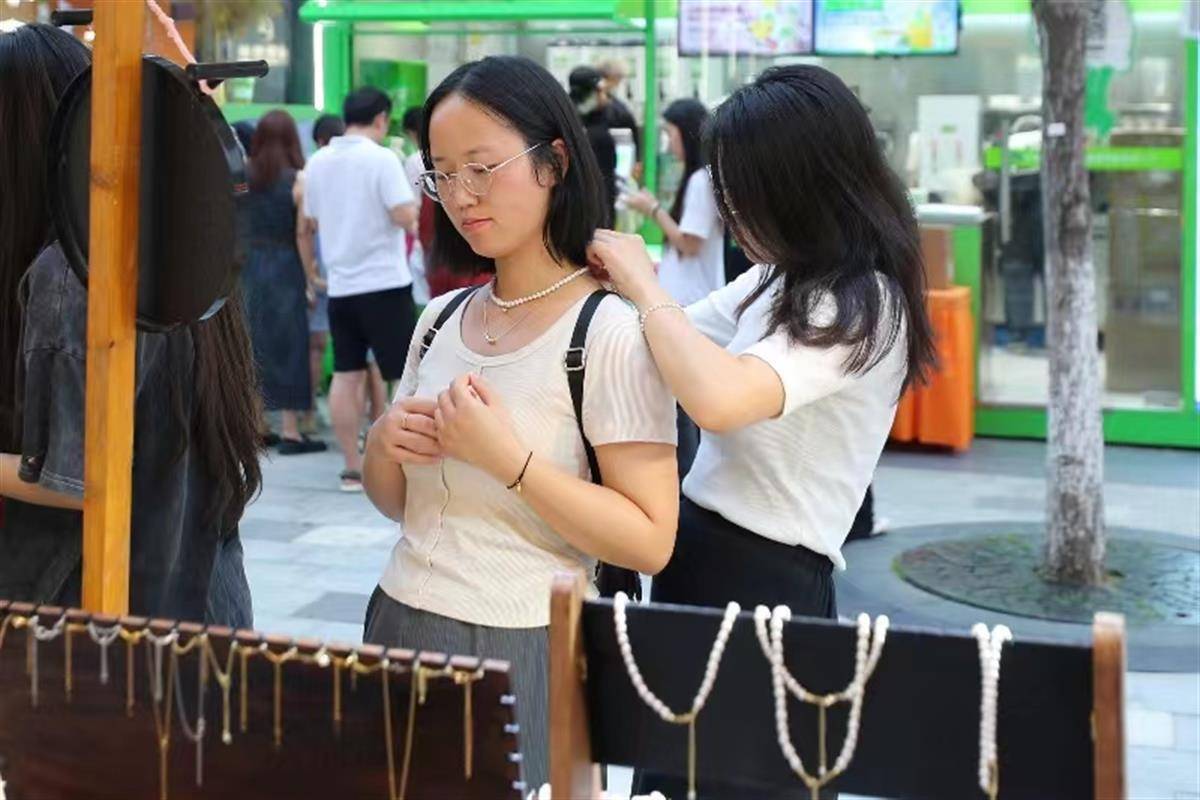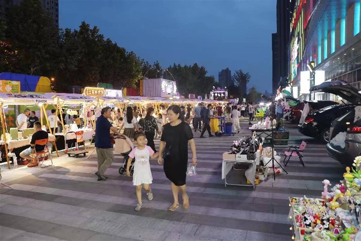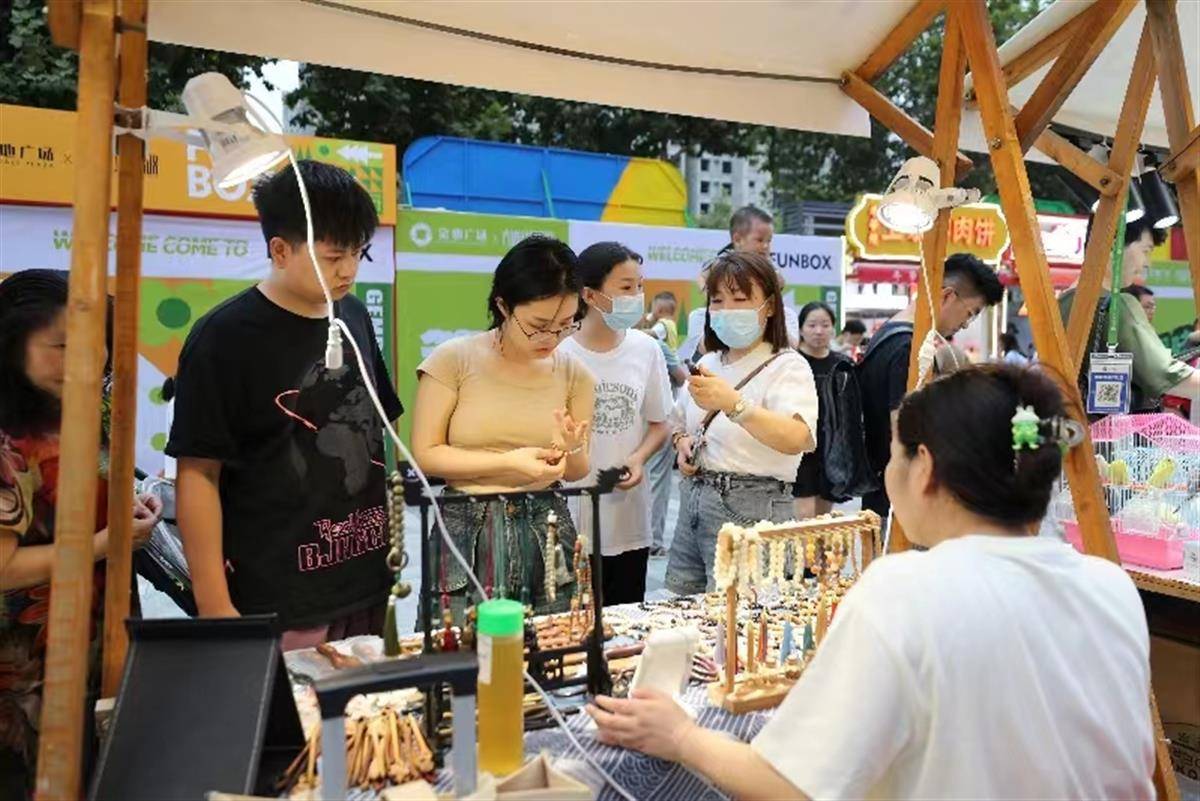 夜幕降临,华灯初上,整齐划一的摊位在金地广场一字排开。摊主的叫卖声、游客的交谈声、“趣玩电音趴”的音乐声此起彼伏,各色招牌光影交错,各种美食琳琅满目,各类小商品创意新潮,灯光璀璨中人潮涌动。市民游客赏夜景、逛夜市、品美食、看电影,沉浸式体验家门口的人间烟火。
