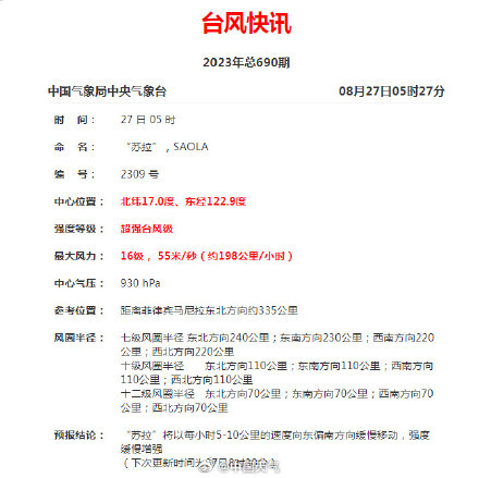 9号台风“苏拉”已于昨天夜间由强台风级加强为超强台风级。今年海上非常盛产超强台风,截至目前,今年一共生成了10个台风,其中“玛娃”、“杜苏芮”、“卡努”、“兰恩”在巅峰时都曾达到过超强台风级别,“苏拉”成为今年第5个超强台风。相比常年,今年超强台风个数明显偏多。台风苏拉将进入台湾海峡中央气象台预计,“苏拉”将先在菲律宾吕宋岛东北部洋面徘徊,29日开始向西北方向移动,向台湾岛南部到巴士海峡一带海域靠近,强度维持或有所减弱,将于30日夜间掠过台湾岛南部,并将于31日白天进入台湾海峡。