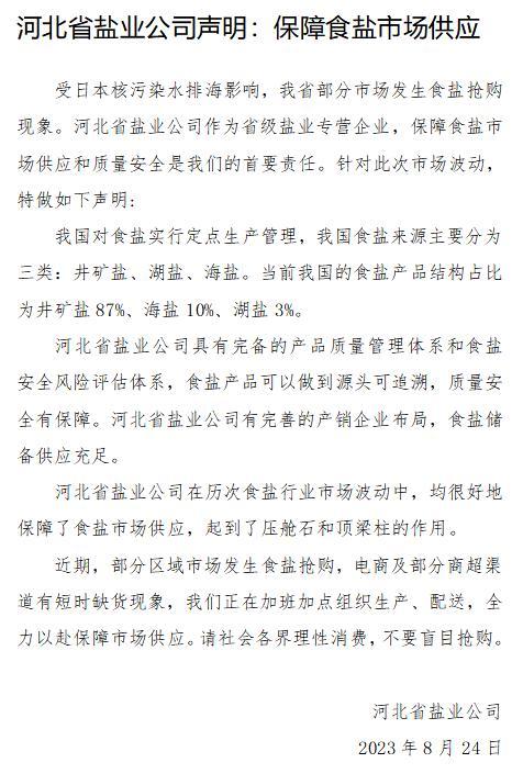 8月25日,河北省市场监管局召开由各市市场监管部门和25家食盐生产企业、批发企业参加的食盐监管工作座谈会。会议要求各相关企业落实食品安全主体责任,把保障食盐价格稳定和质量安全作为首要责任,切实维护食盐市场秩序,保障人民群众食盐消费安全。会议部署各级市场监管部门加大监督检查和执法力度,严厉打击食盐价格和质量违法行为。