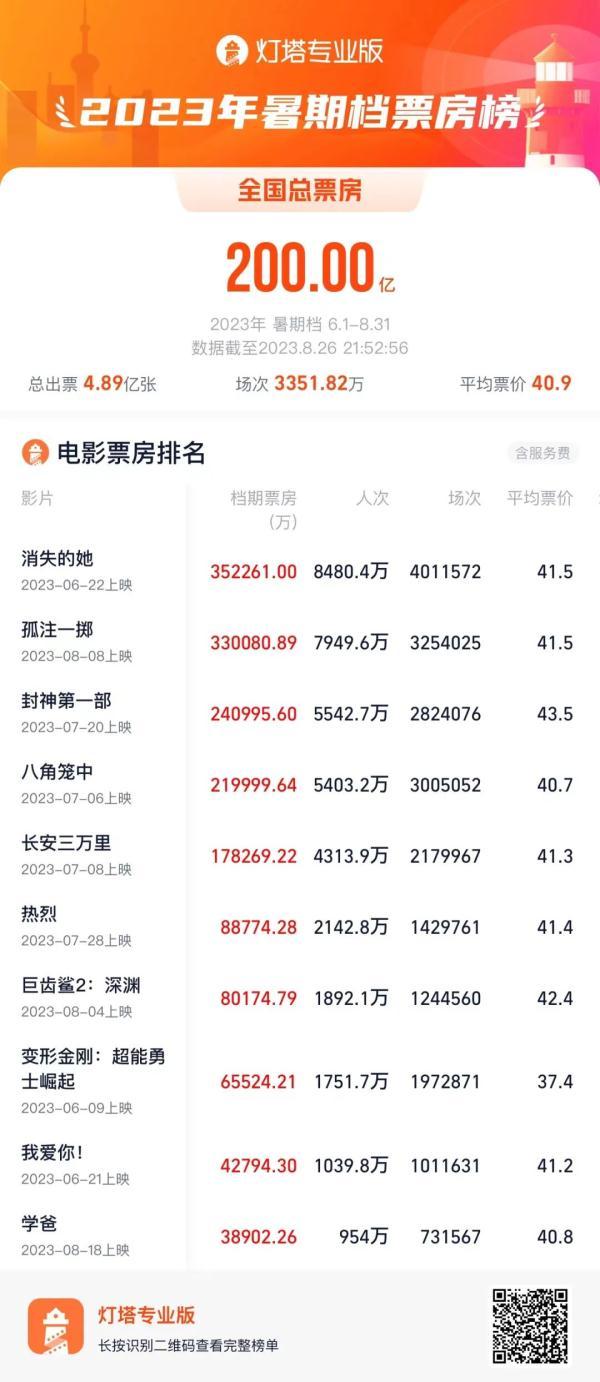 据灯塔专业版,截至8月26日21时52分,2023年暑期档(6月1日-8月31日)总票房(含预售)突破200亿。影片《消失的她》《孤注一掷》《封神第一部》暂列暑期档票房榜前三位。