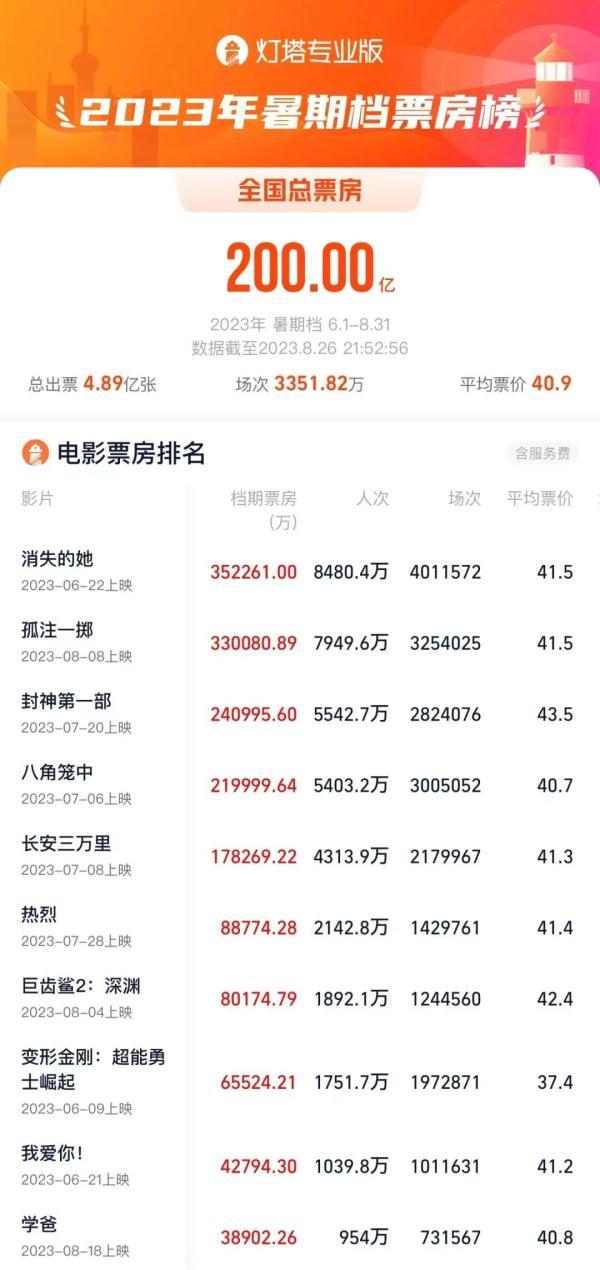据灯塔专业版,截至8月26日21时52分,2023年暑期档(6月1日-8月31日)总票房(含预售)突破200亿。影片《消失的她》《孤注一掷》《封神第一部》暂列暑期档票房榜前三位。