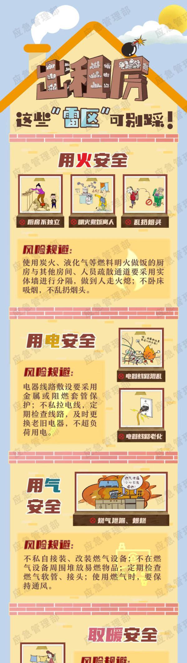 出租房屋时,房东、管理者、租住者都要对房屋进行有效管理和维护,在用火安全、用电安全、用气安全、取暖安全、应急逃生安全、电动车安全、隔断阻燃安全方面,负起安全责任,防患于未然。