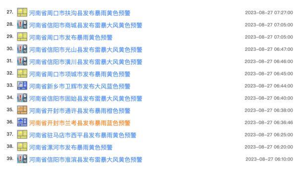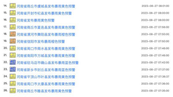 河南省气象台8月27日8时继续发布暴雨黄色预警
