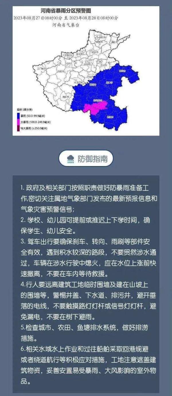 预计8月27日08时至28日08时,开封南部、许昌东部、漯河、平顶山南部、南阳东部、信阳、驻马店、周口、商丘将出现暴雨(50到80毫米),其中南阳东南部、信阳西北部、驻马店南部分县市将出现大暴雨(100到130毫米,个别站点150毫米左右),强降雨时伴有雷电、短时强降水(最大小时降水量40到70毫米)、短时大风(8到10级)等强对流天气。