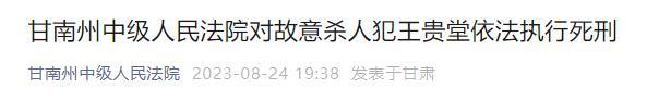 近日,甘肃省甘南州中级人民法院微信公众号发布消息,甘南州中级人民法院对故意杀人犯王贵堂依法执行死刑。