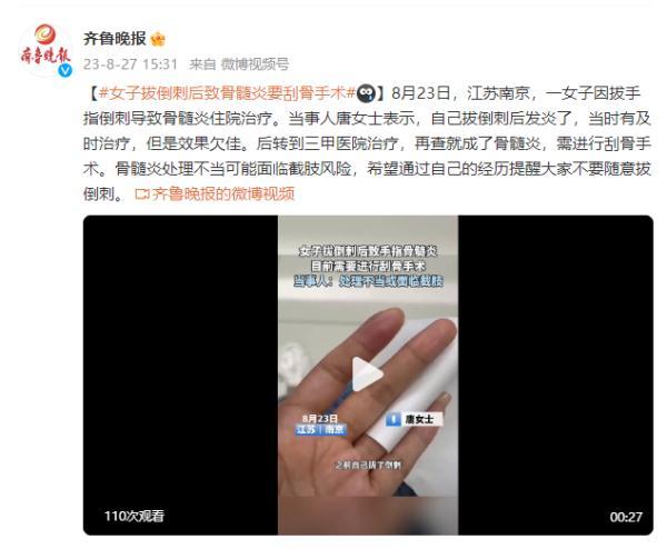 8月23日,江苏南京,一女子因拔手指倒刺导致骨髓炎住院治疗。当事人唐女士表示,自己拔倒刺后发炎了,当时有及时治疗,但是效果欠佳。后转到三甲医院治疗,再查就成了骨髓炎,需进行刮骨手术。骨髓炎处理不当可能面临截肢风险,希望通过自己的经历提醒大家不要随意拔倒刺。