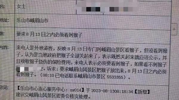 近日,一张“外地游客投诉峨眉山看不到猴子”的投诉记录截图在网络上热传。