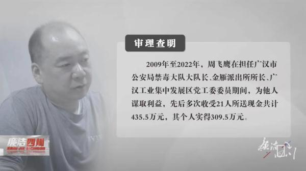 审理查明,2009年至2022年,周飞鹰在担任广汉市公安局禁毒大队大队长、金雁派出所所长、广汉工业集中发展区党工委委员期间,为他人谋取利益,先后多次收受21人所送现金共计435.5万元,其个人实得309.5万元。