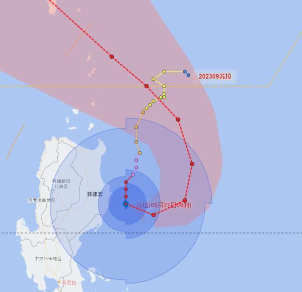 今天(27日)08时台风中心位于距离菲律宾马尼拉东北方向约320公里的洋面上,中心附近最大风力有16级(55米/秒),中心最低气压为930百帕,七级风圈半径220-250公里,十级风圈半径80-100公里,十二级风圈半径50-60公里。