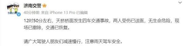 8月27日,据@济南交警 微博消息,济南一天桥桥面发生四车交通事故,全文如下:
