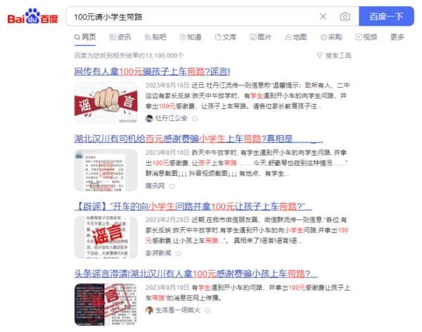 当打开浏览器搜索“100元请小学生带路”时,出现了13100000条搜索结果,这类消息早在2016年就在全国各地传播。