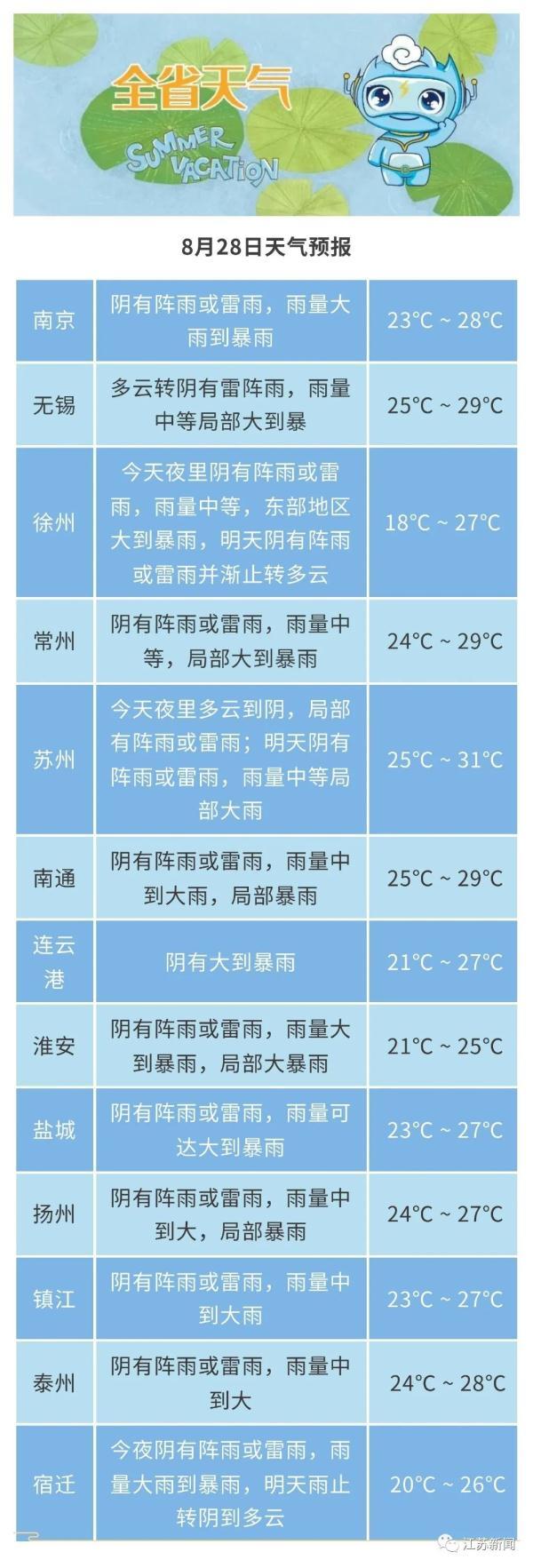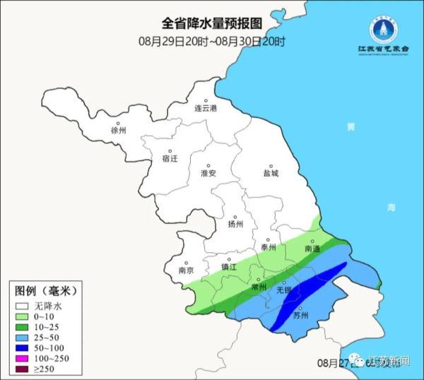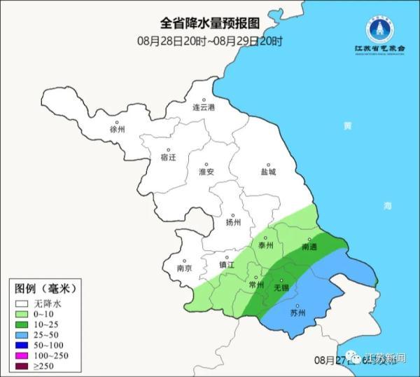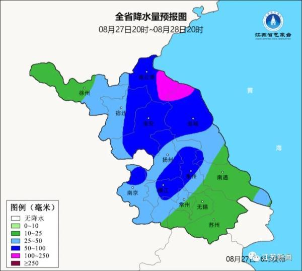 今天白天徐州、宿迁、连云港、淮安等地已出现50毫米以上的强降雨,预计27日夜里到28日白天,徐州、宿迁、连云港、盐城、淮安、扬州、泰州等地的部分地区仍将出现50毫米以上的强降雨,局部可达100毫米以上。