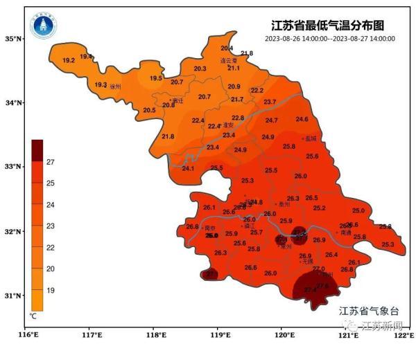 最高温度:淮北地区和本省东南部地区28℃左右,其他地区26℃左右;最低温度:本省西北部地区20~21℃,其他地区23~24℃。