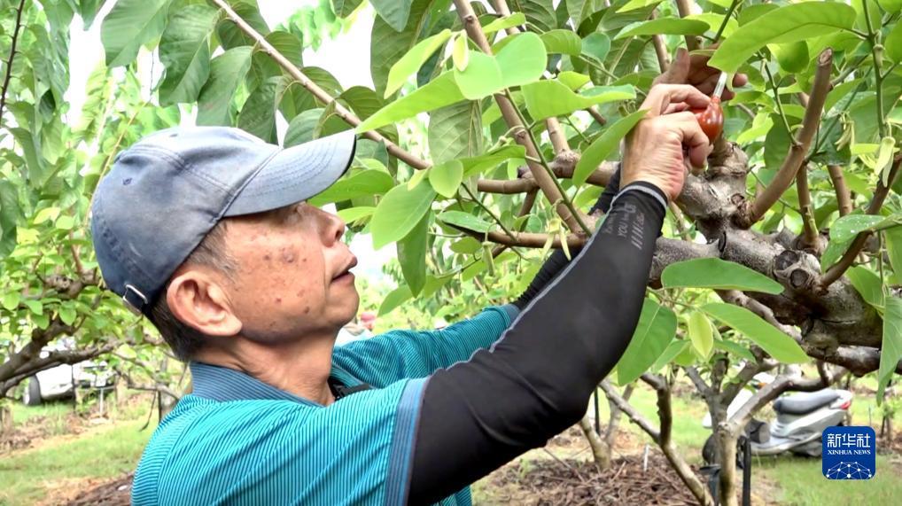果农蔡鸿义在为番荔枝授粉(8月9日摄)。新华社记者 王承昊摄