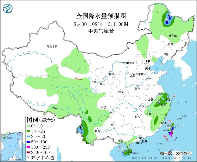 8月29日08时至30日08时,黑龙江南部和东部、吉林东北部、上海、浙江西部和北部、福建中部、广东西南部、海南岛大部、云南西南部和北部、台湾岛东部等地部分地区有大到暴雨,其中,黑龙江东南部等地局地有大暴雨(100~120毫米)。黑龙江东部、新疆东部、甘肃西部等地部分地区有4~5级风(见图3)。渤海、渤海海峡、黄海大部海域将有6~8级、阵风9级的大风,巴士海峡、台湾以东洋面将有6~8级、阵风9~10级的大风,其中台湾以东洋面和巴士海峡风力可达9~11级、阵风12~13级,台风“苏拉”中心经过的附近海域风力可达12~16级、阵风17级及以上。