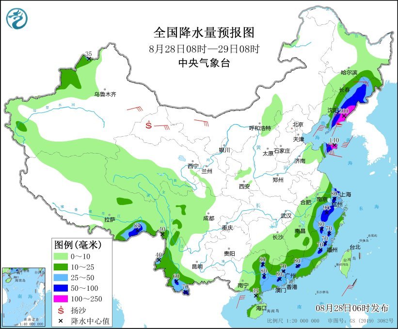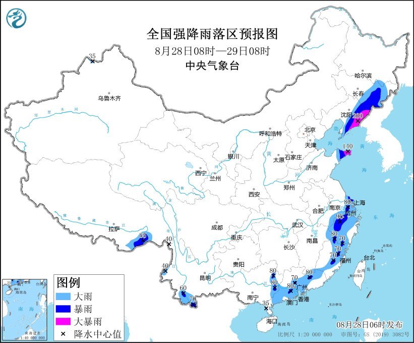 28日至29日,山东半岛东部、东北地区东部、江南东部、华南中东部等地部分地区有大到暴雨,局地大暴雨,上述部分地区并伴有短时强降水、雷暴大风或冰雹等强对流天气。预计,8月28日08时至29日08时,辽宁东部、吉林东部、山东半岛东部、上海、浙江、福建中东部、广东中南部、广西东部、云南西南部、西藏东南部等地部分地区有大到暴雨,其中,辽宁东部、吉林东南部、山东半岛东部等地局地有大暴雨(100~200毫米)(见图1)。上述部分地区伴有短时强降水(最大小时降雨量30~50毫米,局地可超过70毫米),局地有雷暴大风或冰雹等强对流天气。中央气象台8月28日06时继续发布暴雨黄色预警。