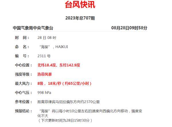 今年第11号台风“海葵”已于今天(8月28日)上午生成,目前其中心位于距离菲律宾马尼拉偏东方向约2370公里的海面上,“海葵”将以每小时10公里左右的速度向西偏北方向移动,强度变化不大。截至目前,西北太平洋上有“苏拉”“达维”“海葵”三个台风同时活跃,形成“三台共舞”。