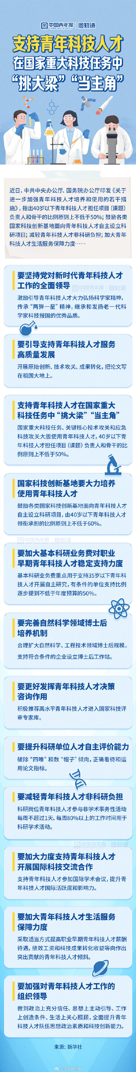 近日,中共中央办公厅、国务院办公厅的印发《关于进一步加强青年科技人才培养和使用的若干措施》指出,40岁以下青年科技人才担任项目(课题)负责人和骨干的比例原则上不低于50%;鼓励各类国家科技创新基地面向青年科技人才自主设立科研项目;减轻青年科技人才非科研负担;加大青年科技人才生活服务保障力度……转发了解,一起奉献青春和智慧。