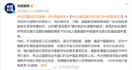 对此,外交部发言人汪文斌表示,美方无理扣留、盘查、遣返中国留学生,还对中国留学生捏造莫须有的罪名,这是出于政治目的滥施打压迫害。中方对此坚决反对。我们敦促美方将欢迎中国留学生的表态落到实处,撤销充满偏见歧视的10043号行政令,停止以国家安全为借口打压中国赴美留学人员。中方将继续采取必要措施维护中国公民的合法权益,也提醒赴美留学人员警惕相关风险。(央视新闻)