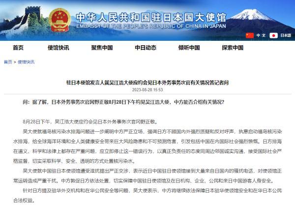 据中国驻日本国大使馆网站28日消息,驻日本使馆发言人就吴江浩大使应约会见日本外务事务次官有关情况答记者问。