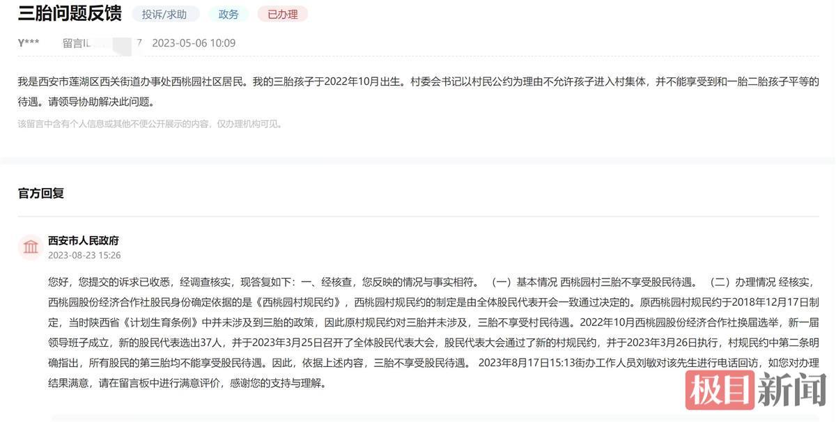 今年5月,上述居民在人民网地方领导留言板留言称,“我是西安市莲湖区西关街道西桃园社区居民,我的三胎孩子于2022年10月出生。村委会书记以村民公约为理由,不允许孩子进入村集体,不能享受和一胎二胎孩子平等的待遇。”