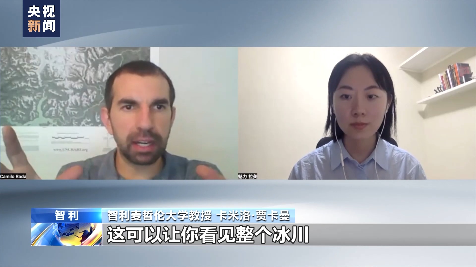 智利麦哲伦大学教授 卡米洛·贾卡曼:它是一个悬挂在山上的冰川,这可以让你看见整个冰川,包括冰川底部和流出的水。