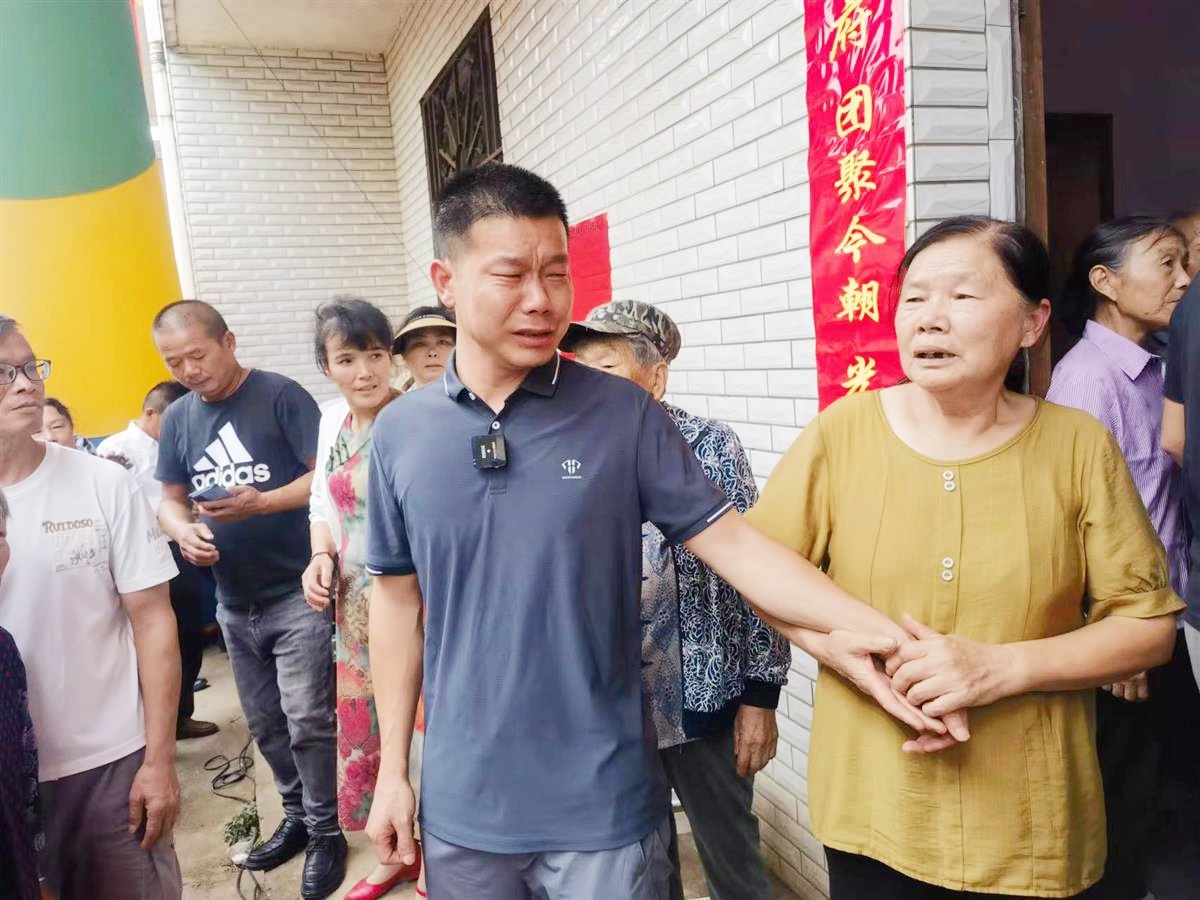8月28日上午,在黄梅县濯港镇茶山咀村村口,宋婆婆和女儿、小儿子一早便等候在路旁,翘首以盼等着大儿子回家。上午11时18分,当车队驶进村口时,车子还没停稳,宋婆婆便冲上前,一眼认出了从车上下来的大儿子。她右手抱着一束鲜花,腾出左手一把将高出自己一个头的儿子搂进怀中。压抑了34年的感情就像脱闸的洪水得到了释放,宋婆婆禁不住失声痛哭,民警和旁边围观的村民见状,也忍不住偷偷抹泪。