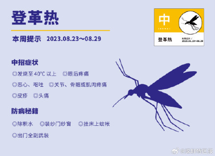 近期,深圳降雨频繁天气湿热,蚊虫增多,容易引起登革热、肠道等传染病流行。深圳市疾控中心最新监测数据显示,当前(8月23日至8月29日)登革热的风险等级为“中”,这是一种由登革病毒引起的急性虫媒传染病。深圳疾控表示,市民要尽量避免蚊虫叮咬并做好个人防护,如出现发热、出疹或骨痛,要及时到正规医疗机构就诊。
