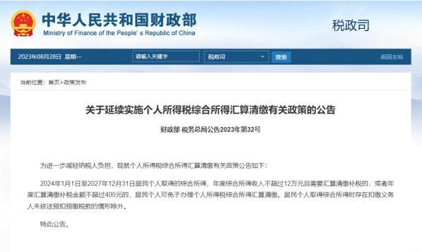 关于延续实施个人所得税综合所得汇算清缴有关政策的公告为进一步减轻纳税人负担,现就个人所得税综合所得汇算清缴有关政策公告如下:2024年1月1日至2027年12月31日居民个人取得的综合所得,年度综合所得收入不超过12万元且需要汇算清缴补税的,或者年度汇算清缴补税金额不超过400元的,居民个人可免于办理个人所得税综合所得汇算清缴。居民个人取得综合所得时存在扣缴义务人未依法预扣预缴税款的情形除外。