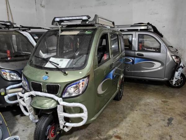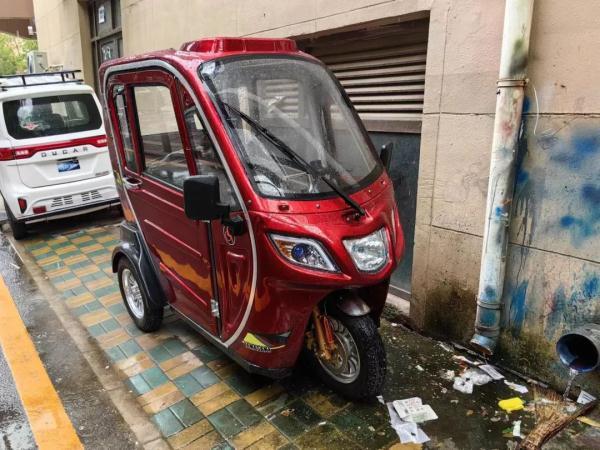 这两辆车都是三轮燃油车。一辆是白洋淀BYD50QZK车型,售价8000元,四周没有遮蔽,而且需要跨坐在座位上。另外一辆虽然是全封闭的,售价1万5千元,但车内空间狭窄。