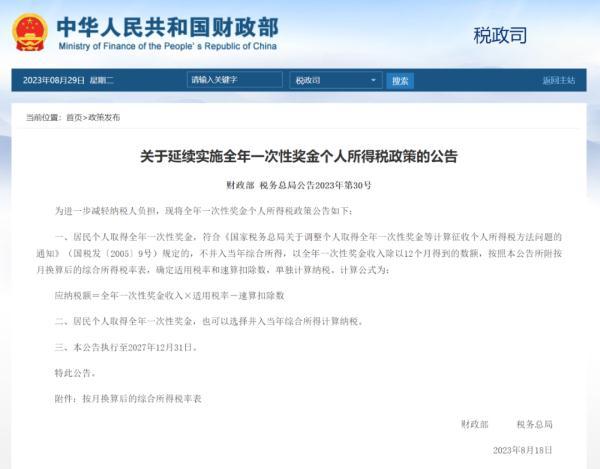 关于延续实施全年一次性奖金个人所得税政策的公告