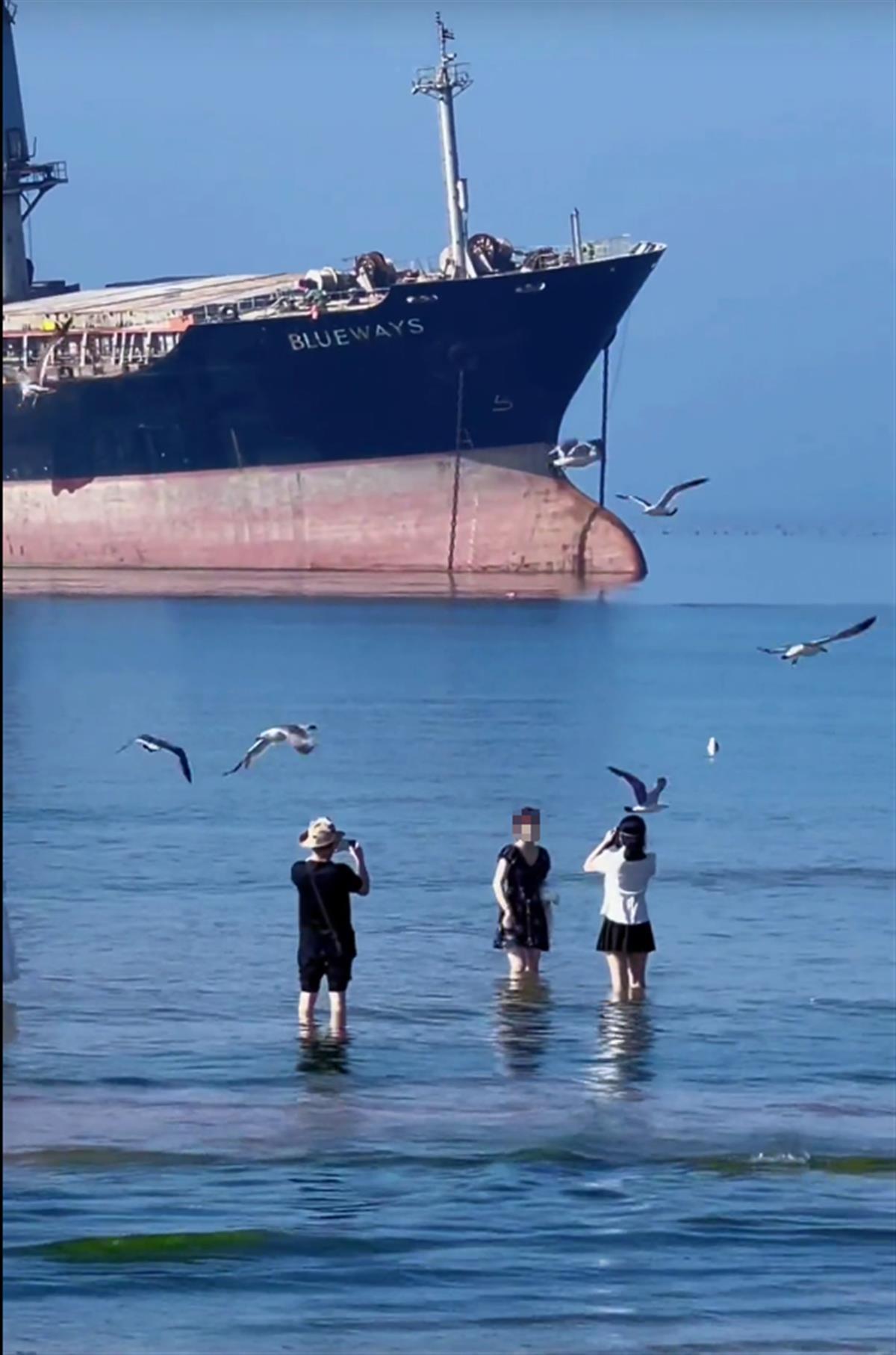 8月29日,极目新闻记者查询发现,山东一家媒体曾报道,2022年9月19日,受台风“南玛都”外围环流和冷空气共同影响,巴拿马籍散货船“BLUEWAYS”在威海成山镇附近海域搁浅进水,船上25人遇险。交通运输部北海救助局派遣救助船舶和救助直升机救助。经近40分钟紧急救助,机组人员通过吊运方式将25名遇险人员接救至附近岸边,移交有关部门。该报道中的搁浅散货船“BLUEWAYS”正是游客所拍摄照片和视频中的巨轮。