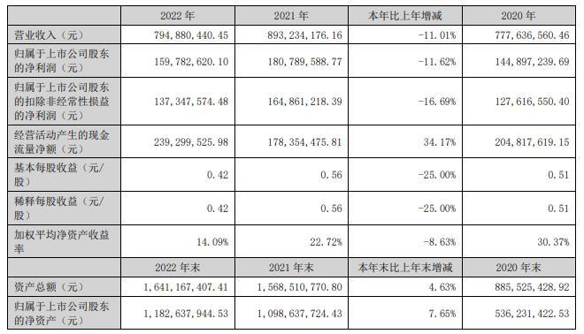 东亚机械2022年年度报告显示,2022年,东亚机械实现营业收入7.95亿元,同比下滑11.01%;归属于上市公司股东的净利润1.60亿元,同比下滑11.62%;归属于上市公司股东的扣除非经常性损益的净利润1.37亿元,同比下滑16.69%;经营活动产生的现金流量净额2.39亿元,同比增长34.17%。