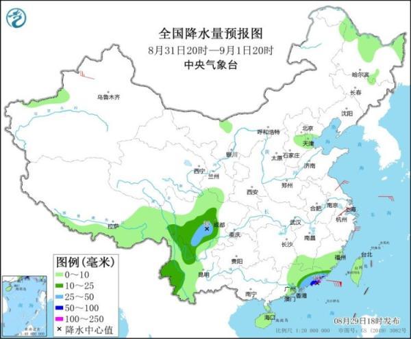 8月31日20时至9月1日20时,四川西南部、云南北部和西部、福建南部、广东东部等地的部分地区有中到大雨,其中,广东东部沿海的部分地区有暴雨或大暴雨(100~180毫米)。内蒙古中部、辽东半岛、浙江、福建和广东东部沿海等地有4~6级风。