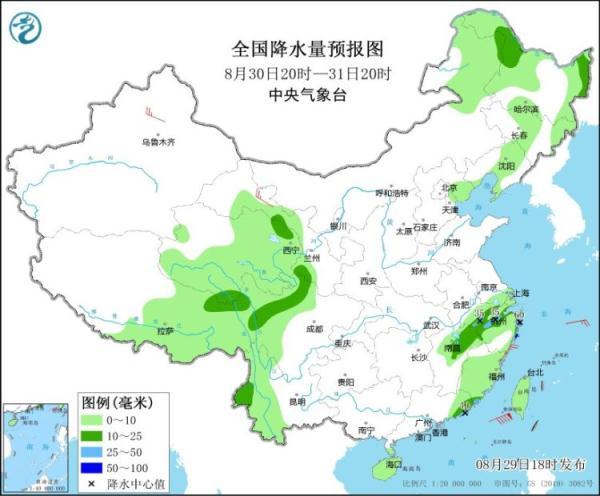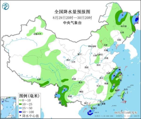 图2 全国降水量预报图(8月29日20时-30日20时)