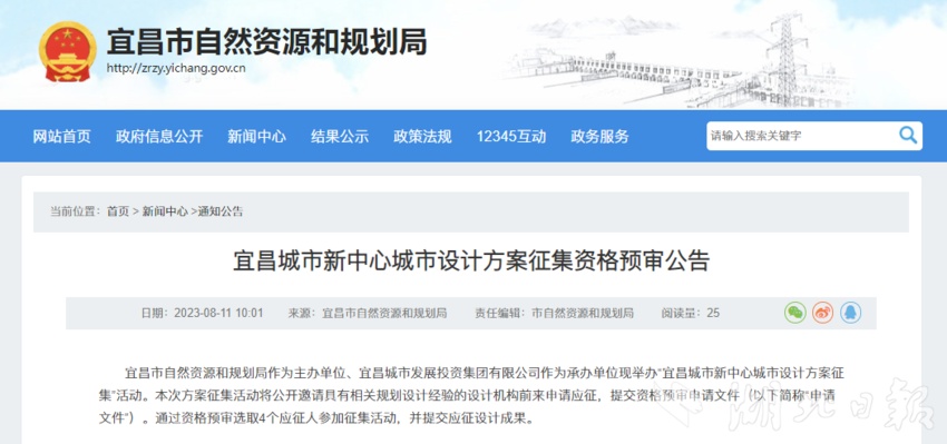 宜昌市委七届五次全会明确“坚持环境营造优先、基础设施先行,加快伍家岗城市新中心建设,聚集总部经济、金融服务、活力商业、生态休闲等多元混合功能,打造世界级宜昌城市新中心和全球低碳发展样板”工作思路。8月11日,宜昌市自然资源和规划局发布《宜昌城市新中心城市设计方案征集资格预审公告》,正式面向全球征集伍家岗新中心城市设计方案。