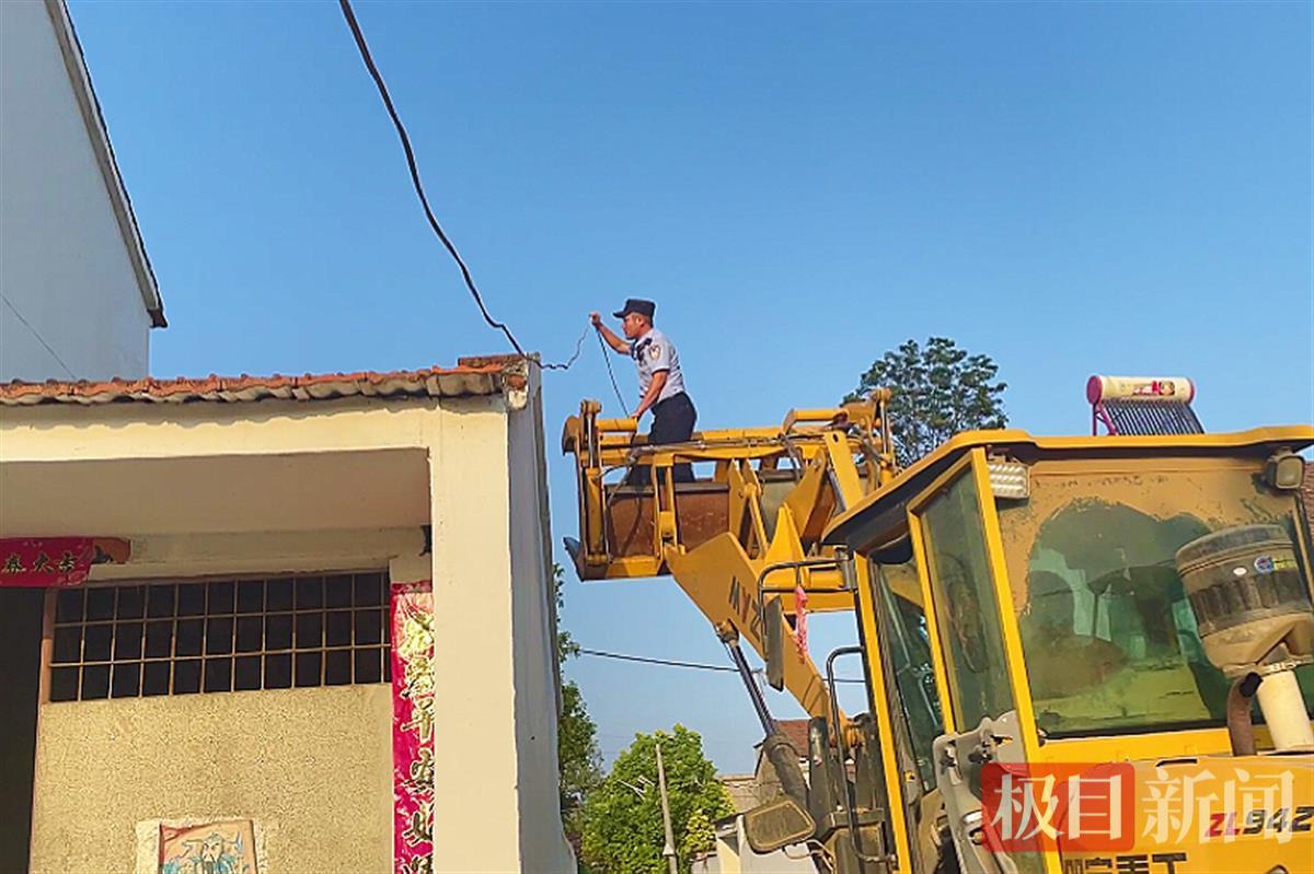 村民屋顶的电线被收割机挂掉,掉落路面影响车辆出行,铲车司机伸出援手,警民合力将电线固定至墙壁,及时消除了安全隐患。