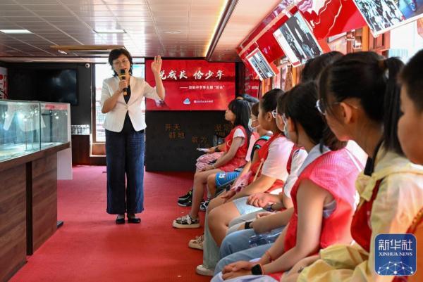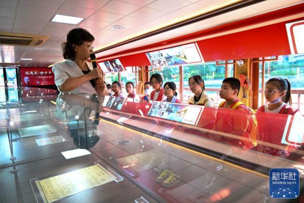8月29日,天津博物馆副馆长、李叔同故居纪念馆馆长沈岩(左一)在海河游船上为小朋友讲解。
