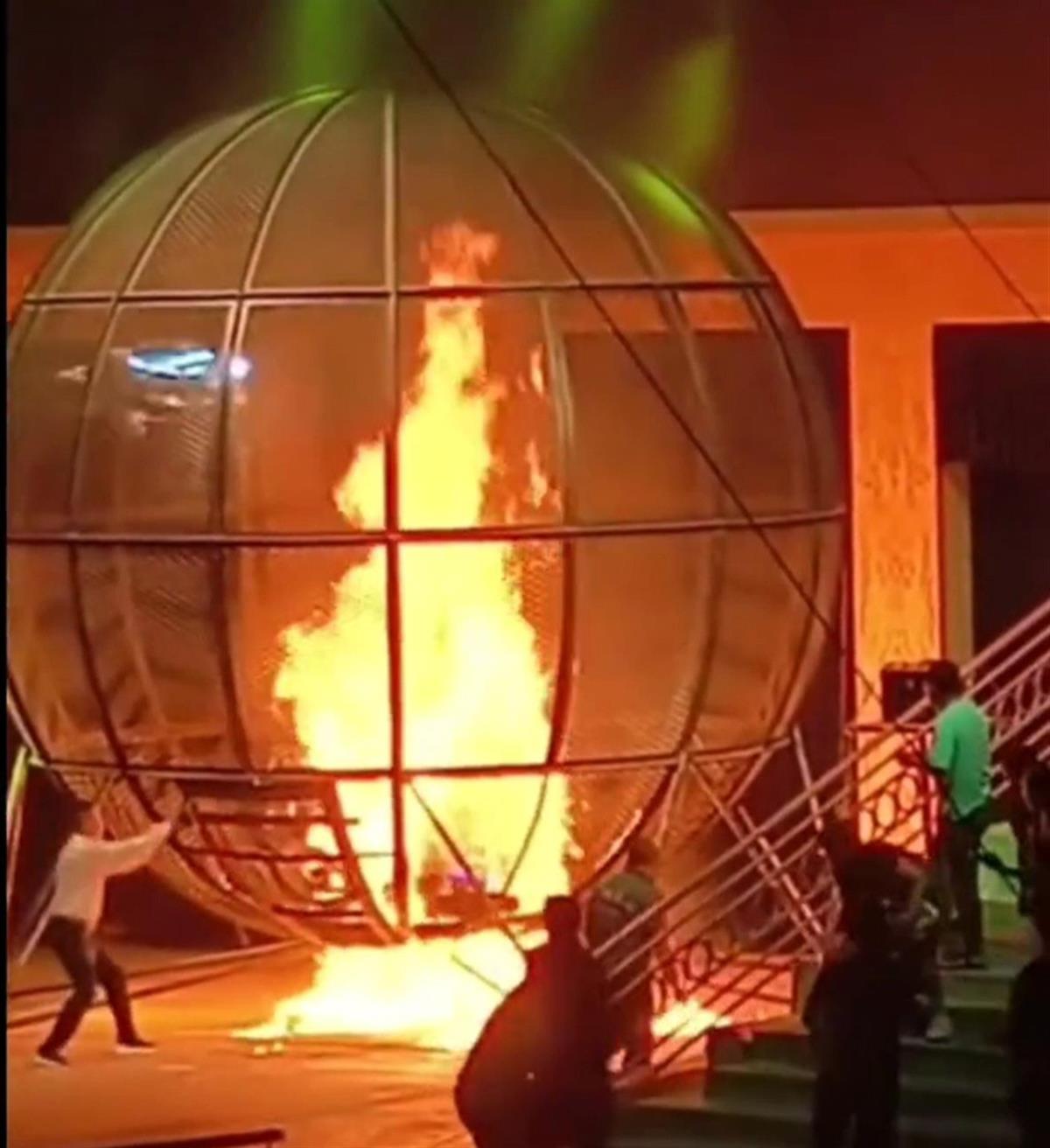 多段视频显示,在一铁笼内,两名杂技演员骑着摩托车沿笼壁高速转圈,摩托车尾部不断冒出火星。突然,一名演员随车坠落至铁笼底部,现场瞬间燃起大火,另一名演员则仍在笼子上半部分转圈。现场不断有观众高喊“快点救他”,有人打开了铁笼的门,还有人拿起灭火器灭火。