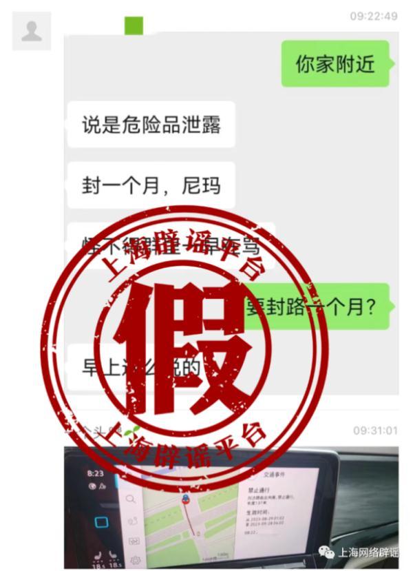 8月29日,微信圈群流传聊天记录称,上海浦东新区川沙附近有毒气泄漏情况,导致路面拥堵。也有粉丝向上海辟谣平台留言问,听说相关路段要封路一个月,是不是真的。