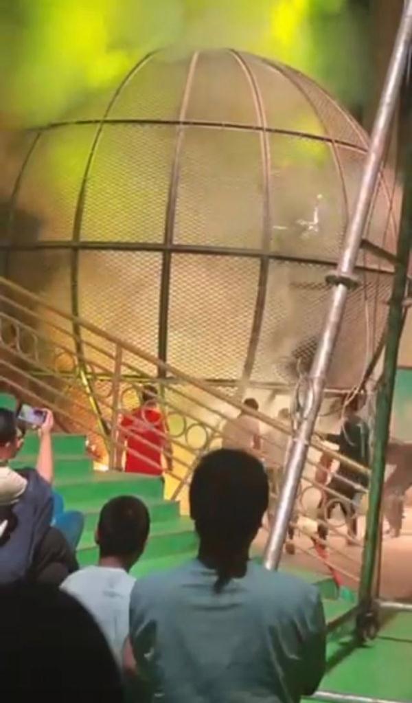 视频中,两名表演者骑着摩托车在一个球状装置内部表演,两辆摩托车后还冒着闪闪火星,刺激的表演引得观众阵阵惊呼。然而,其中一名表演者疑似撞到了哪里突然坠落,球状装置内立即起火,火势升腾,另一名表演者只能骑着摩托车绕着火躲避,现场受到惊吓的观众发出惊呼。表演装置外的工作人员立即拿来灭火器,很快将火扑灭。另有网友拍摄的视频显示,火势被扑灭后,一位表演者躺在地上,有人为其解除身上的装备。
