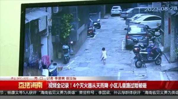 28号下午,海口蔬菜公司宿舍小区的住户怎么也想不到,在小区内,竟然有几个灭火器和灭火箱从天而降,险些砸中过往的孩子。
