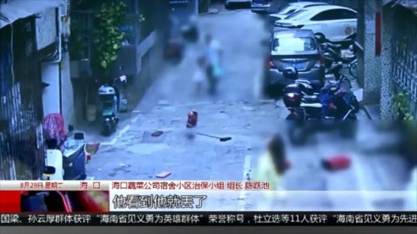 海口蔬菜公司宿舍小区 住户 陆先生:当时是我几个孩子回来,我爱人在后面,他们跑得快,然后到那个线的时候,那个东西就下来了,他连续抛了有四个灭火器,然后我爱人就在后面就报了警。