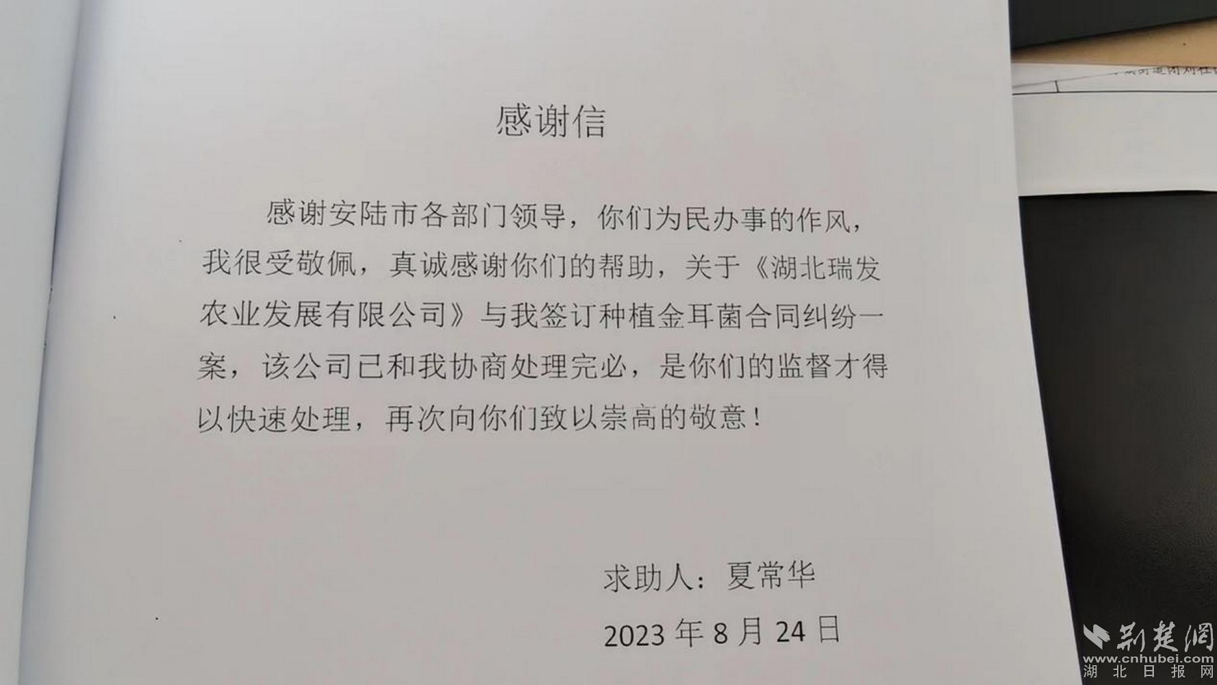 原来,2023年春,夏某某通过网络平台看到一则来自安陆市雷公镇某公司发出的关于金耳菌种植的宣传广告。夏某某通过实地了解、洽谈,签订了合作合同。后因种种原因,夏某某一直得不到收益回报。因家中突遭变故,导致生活困难,夏某某便写信向安陆信访局求助。安陆市主要领导批阅群众来信时,看到夏某某的信件,当即要求市公安局、市市场监管局、市农业农村局成立工作专班,调查核实相关情况,全力维护群众的正当权益。