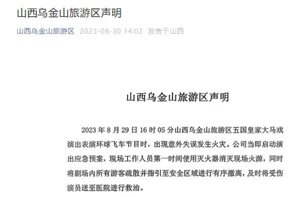 8月30日,山西乌金山旅游区就此事发布声明,称经过十余秒的火灾扑救工作成功扑灭火势,受伤演员已送往医院治疗,该事件未造成人员伤亡,周边建筑物及游客生命财产并未造成损失。