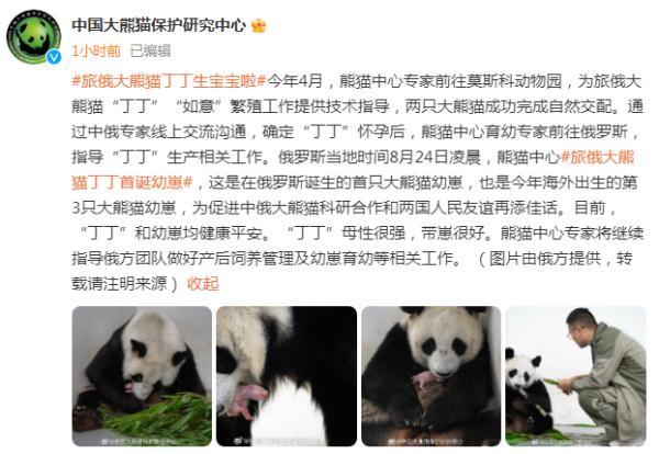 今年4月,熊猫中心专家前往莫斯科动物园,为旅俄大熊猫“丁丁”“如意”繁殖工作提供技术指导,两只大熊猫成功完成自然交配。通过中俄专家线上交流沟通,确定“丁丁”怀孕后,熊猫中心育幼专家前往俄罗斯,指导“丁丁”生产相关工作。俄罗斯当地时间8月24日凌晨,旅俄大熊猫丁丁首诞幼崽,这是在俄罗斯诞生的首只大熊猫幼崽,也是今年海外出生的第3只大熊猫幼崽,为促进中俄大熊猫科研合作和两国人民友谊再添佳话。目前,“丁丁”和幼崽均健康平安。“丁丁”母性很强,带崽很好。熊猫中心专家将继续指导俄方团队做好产后饲养管理及幼崽育幼等相关工作。